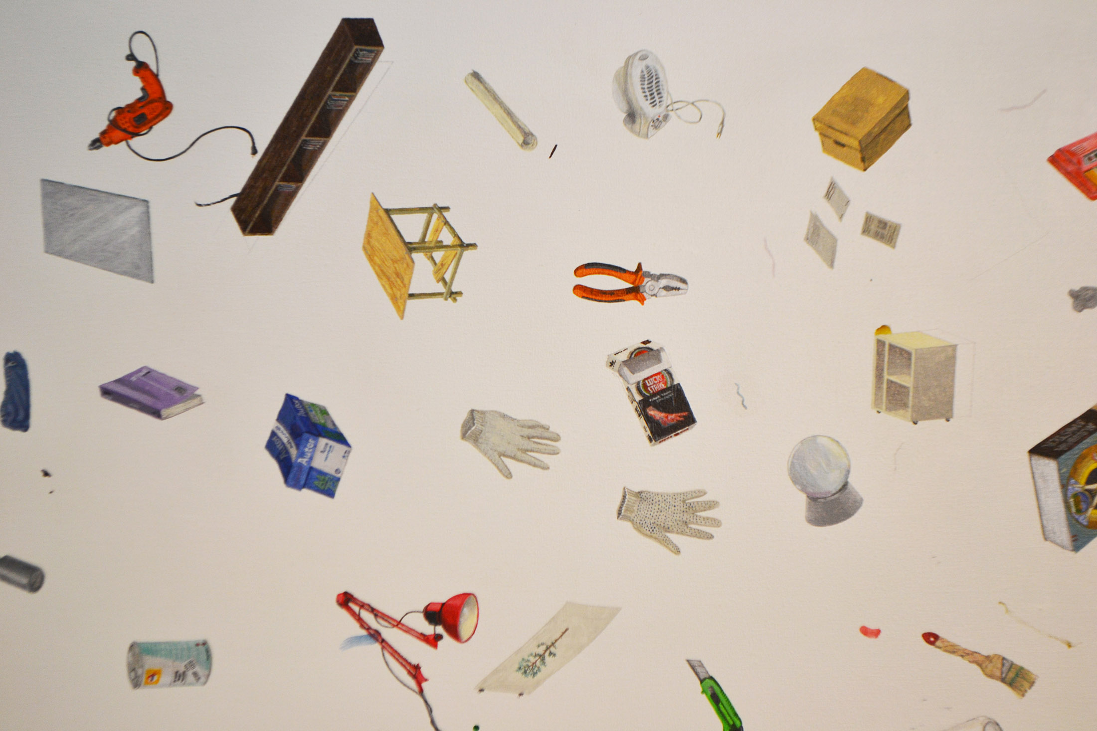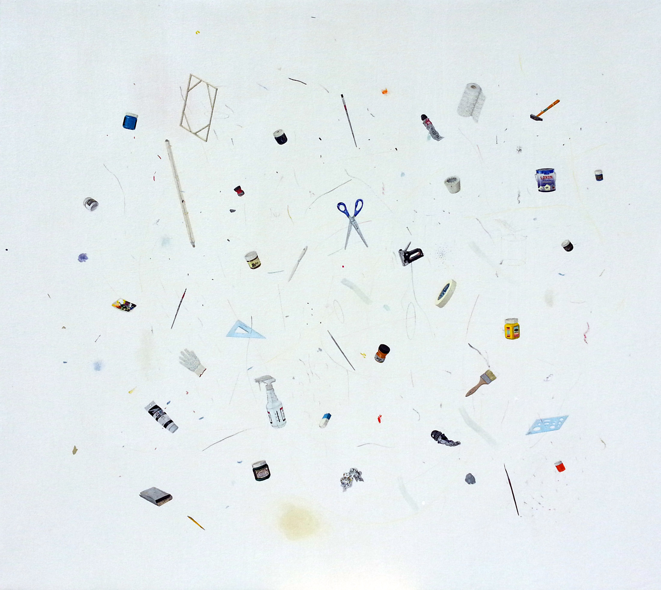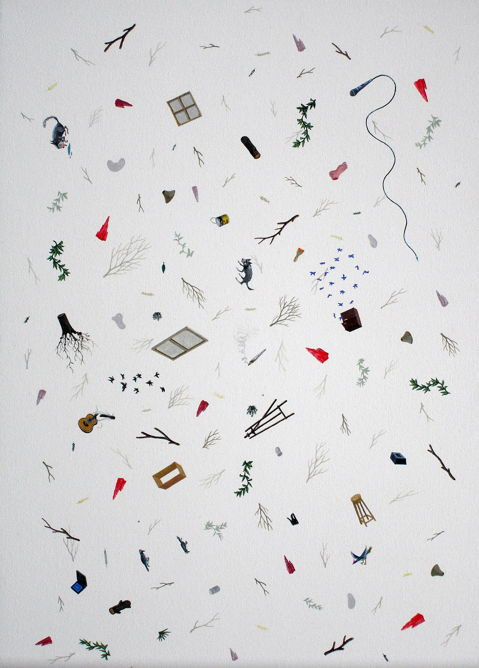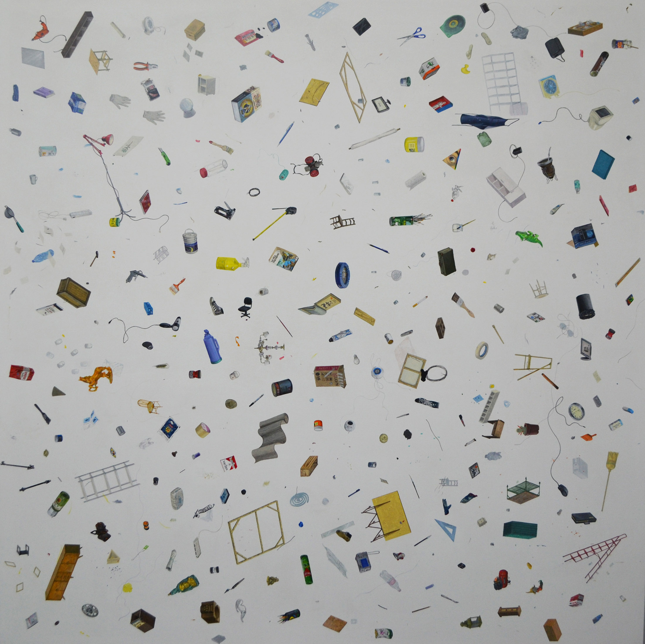 Inventarios reúne una serie de pinturas construidas como listas visuales: objetos y figuras dispuestos en un mismo campo, donde el detalle, la variación y la acumulación funcionan como estructura. Estas obras desplazan los géneros tradicionales —naturaleza muerta y retrato— hacia una lógica de archivo pictórico.