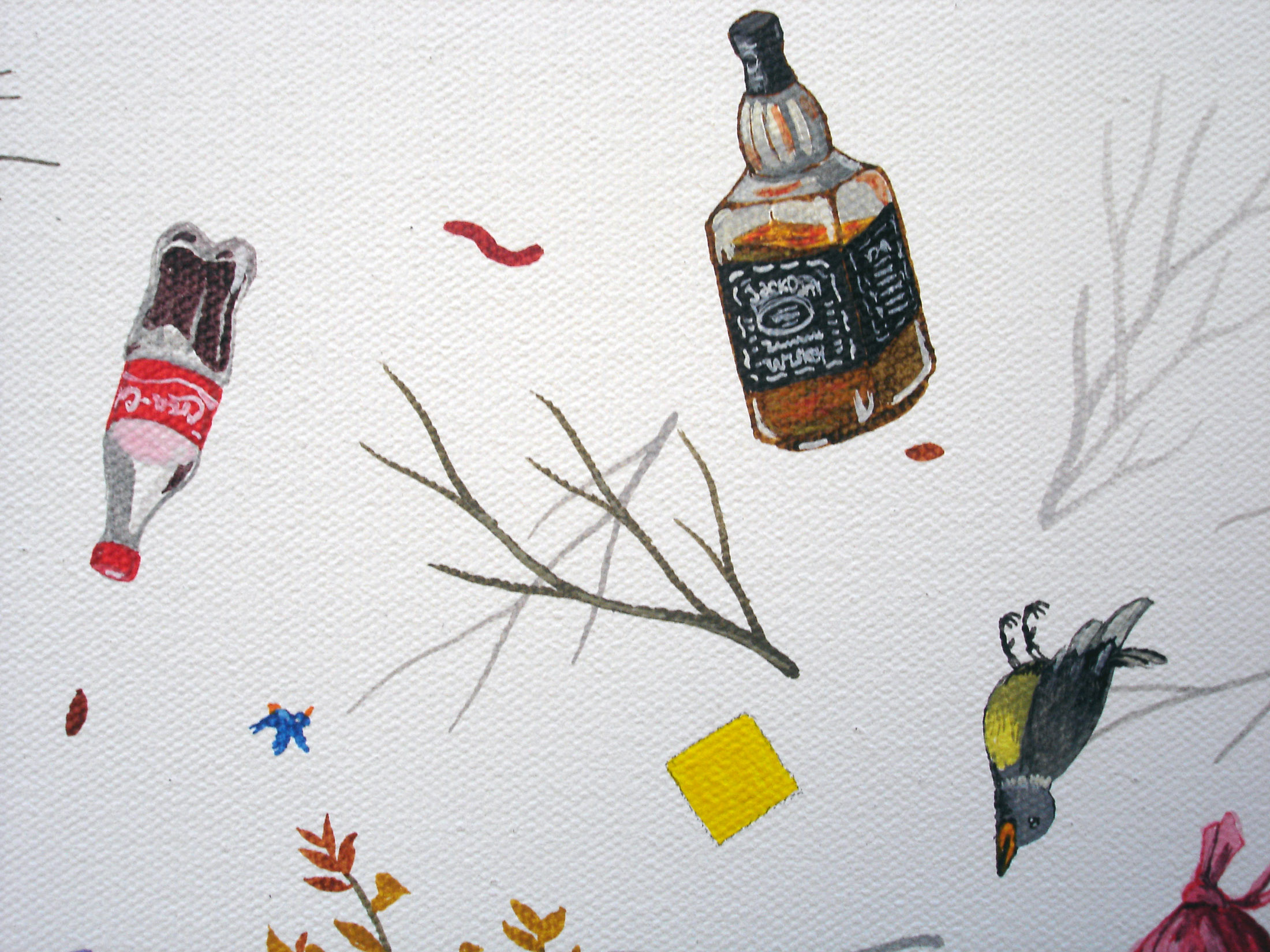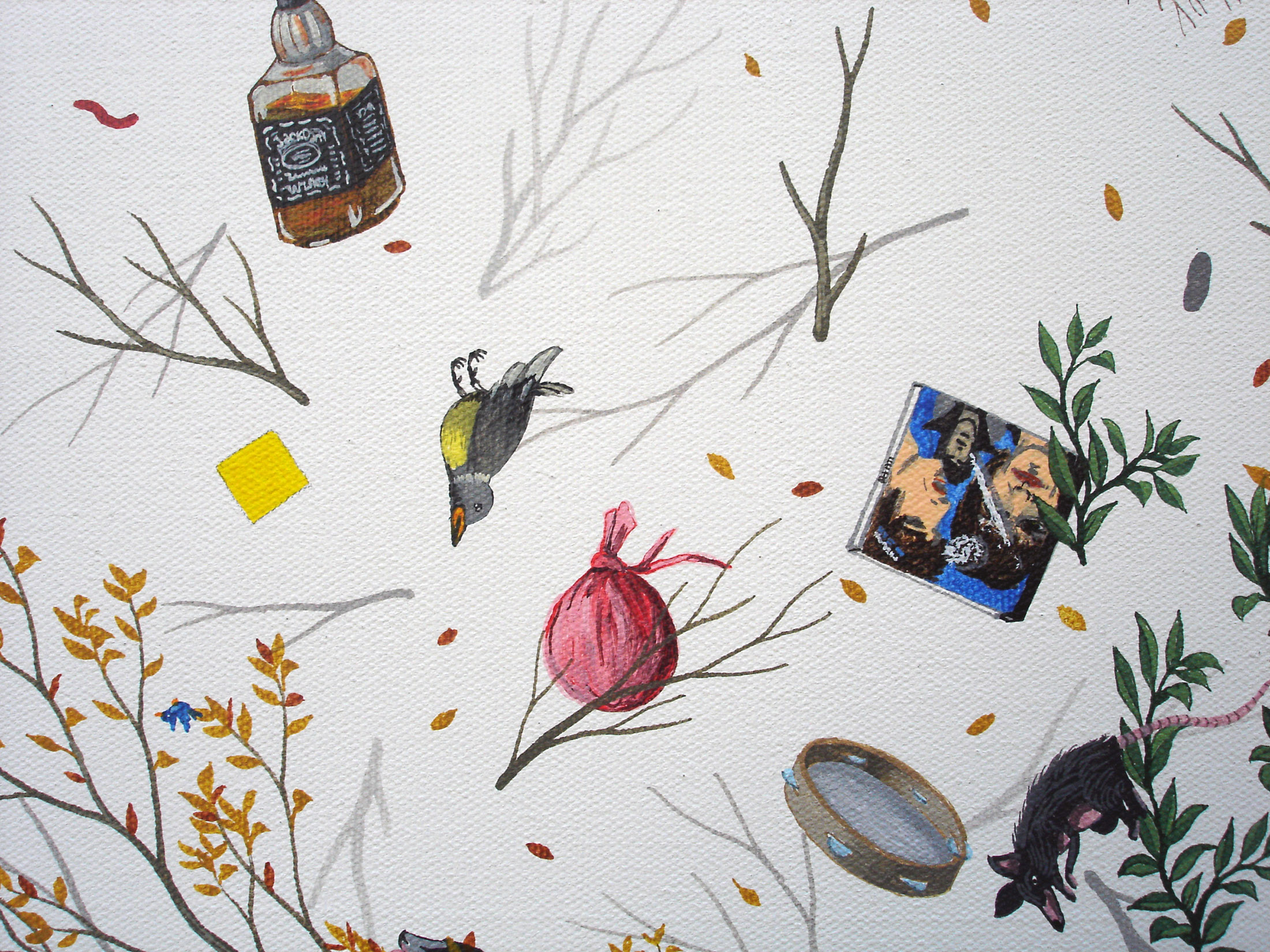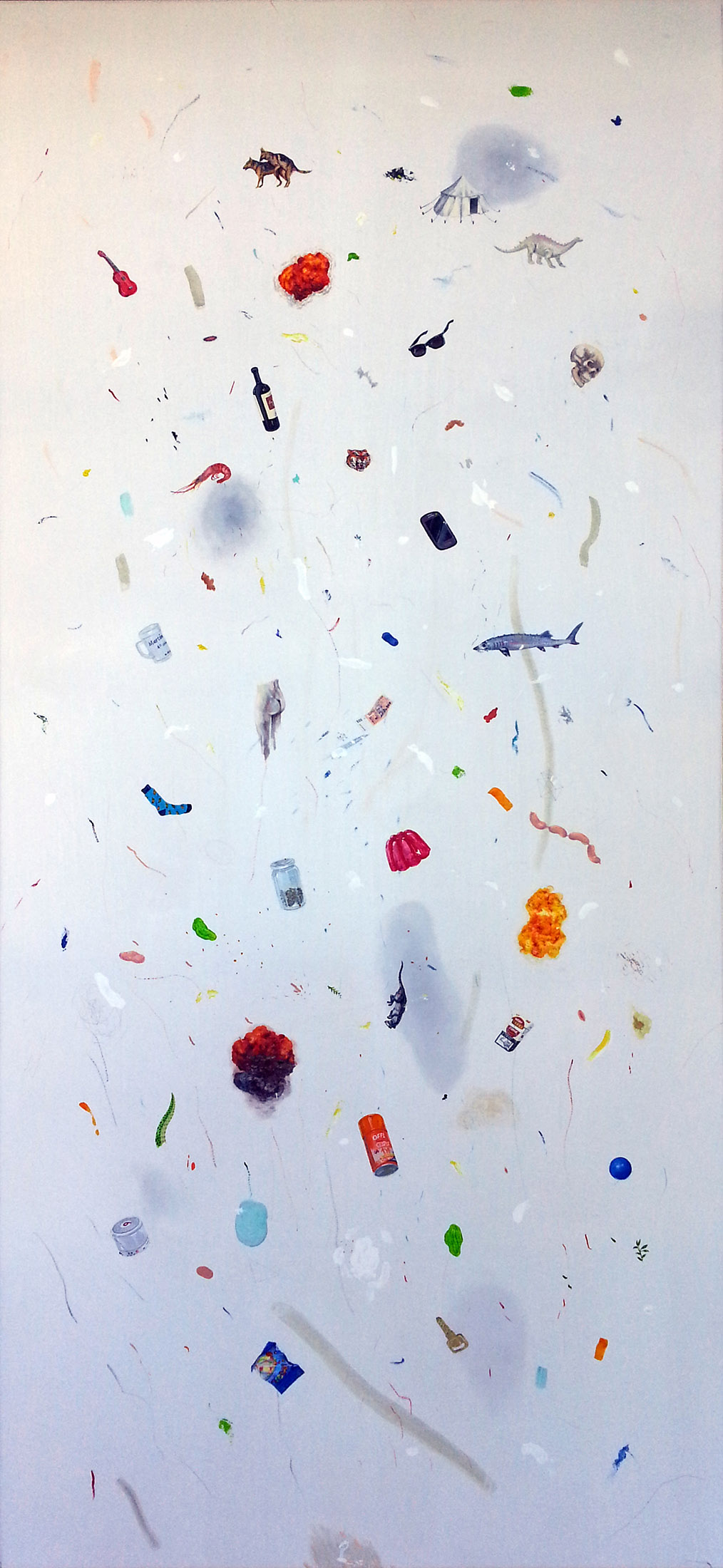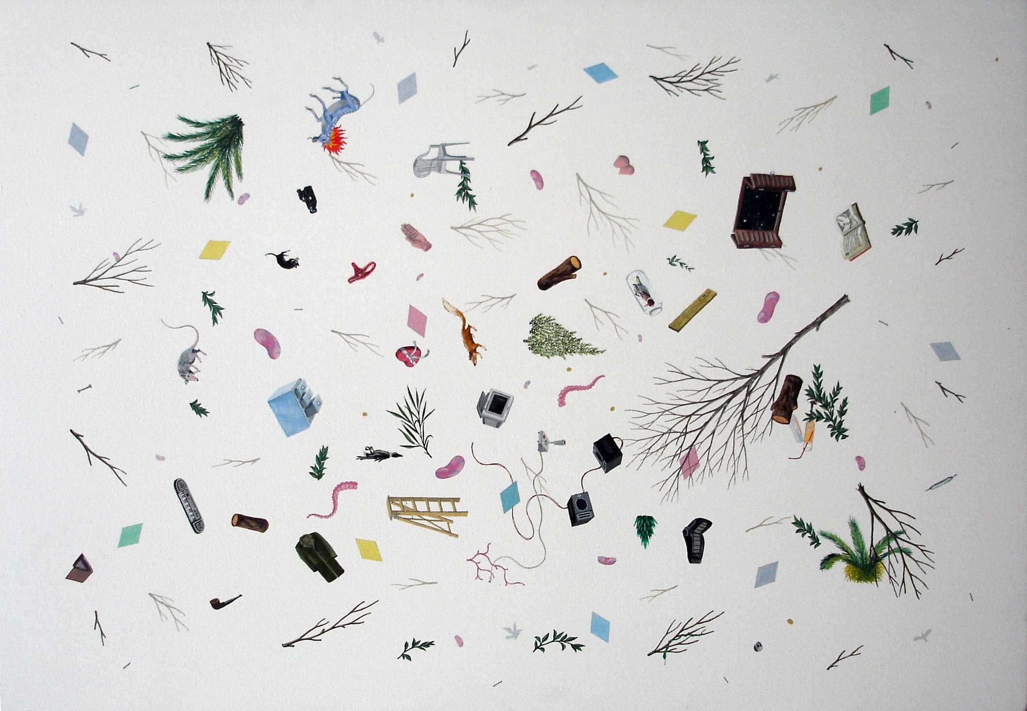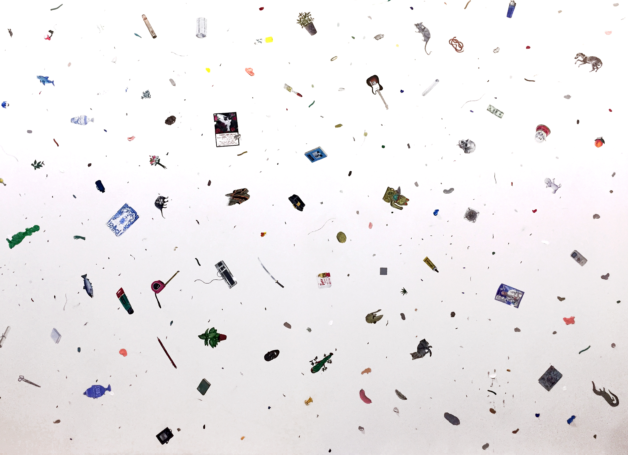 Inventarios reúne una serie de pinturas construidas como listas visuales: objetos y figuras dispuestos en un mismo campo, donde el detalle, la variación y la acumulación funcionan como estructura. Estas obras desplazan los géneros tradicionales —naturaleza muerta y retrato— hacia una lógica de archivo pictórico.